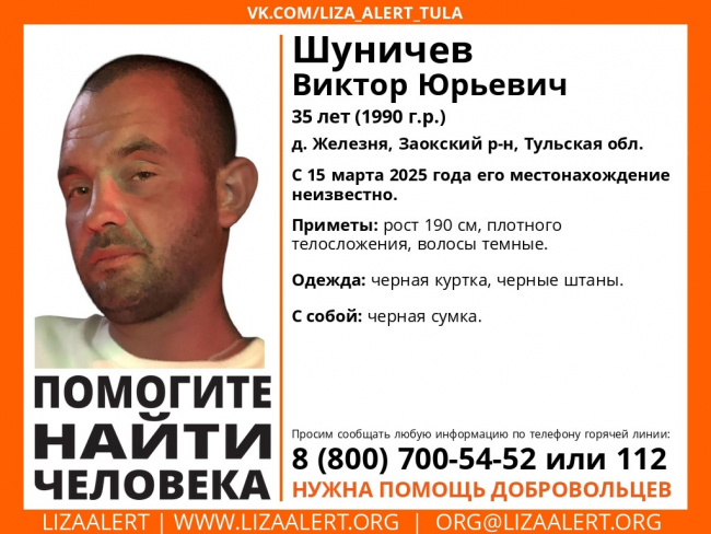 Волонтеры поискового отряда «ЛизаАлерт» разыскивают 35-летнего Виктора Юрьевича Шуничева. Мужчина пропал 15 марта в деревне Железня Заокского района, и почти неделю о его местонахождении ничего не известно.