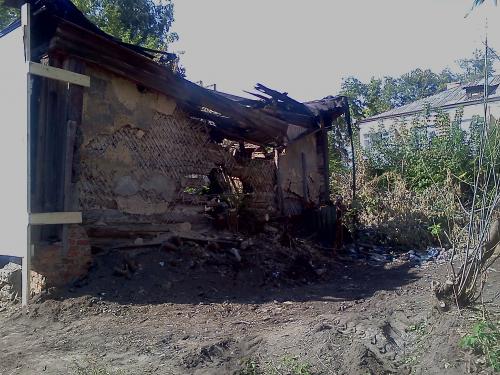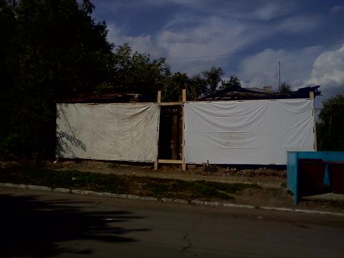 Развалины, которые выходят фасадом на одну из главных улиц города, забили белыми тряпками, чтобы не стращали.