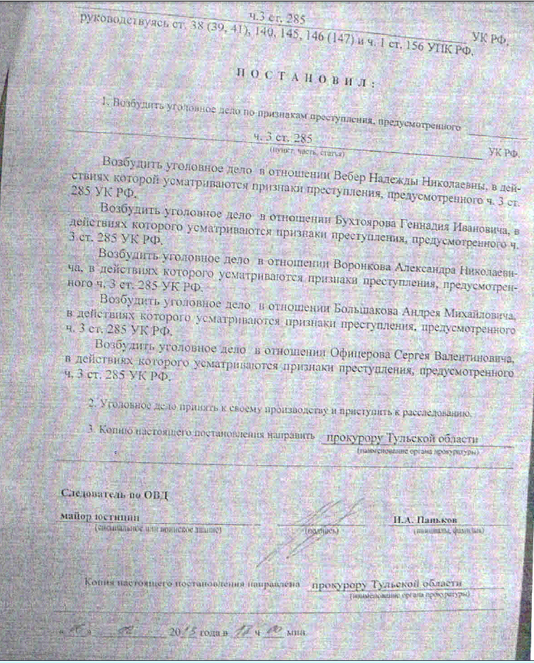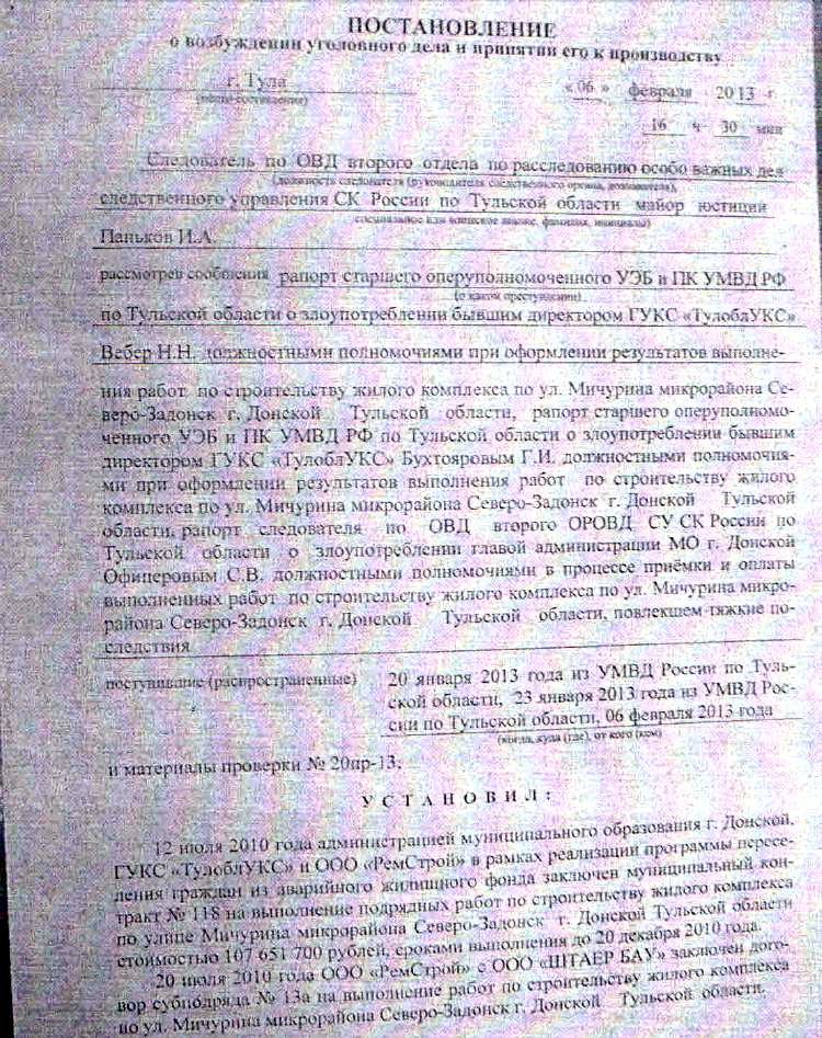 Надежный источник ИА «Тульская пресса» в правоохранительных органах региона предоставил в распоряжении редакции, документы, подтверждающие причастность Надежды Вебер к нашумевшему уголовному делу вокруг махинаций со строительством домов для переселенцев в городе Донской Тульской области.