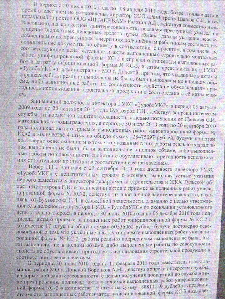 По версии следствия, в рамках реализации муниципального контракта от 12 июля 2010 года № 118 на выполнение подрядных работ по строительству жилого комплекса по улице Мичурина микрорайона Северо-Задонск города Донской Тульской области по программе переселения граждан из аварийного жилья, в период с июля 2010 по апрель 2011 года при осознанном противоправном бездействии главы администрации МО г. Донской, его заместители совместно с директором ГУКС «ТулоблУКС», действуя вопреки интересам службы, из корыстной заинтересованности, подписали акты о приёмке выполненных работ унифицированной формы КС-2 и справки о стоимости выполненных работ и затрат унифицированной формы КС-3, будучи при этом достоверно осведомлёнными о том, что указанные в них работы реально подрядчиком выполнены не были.