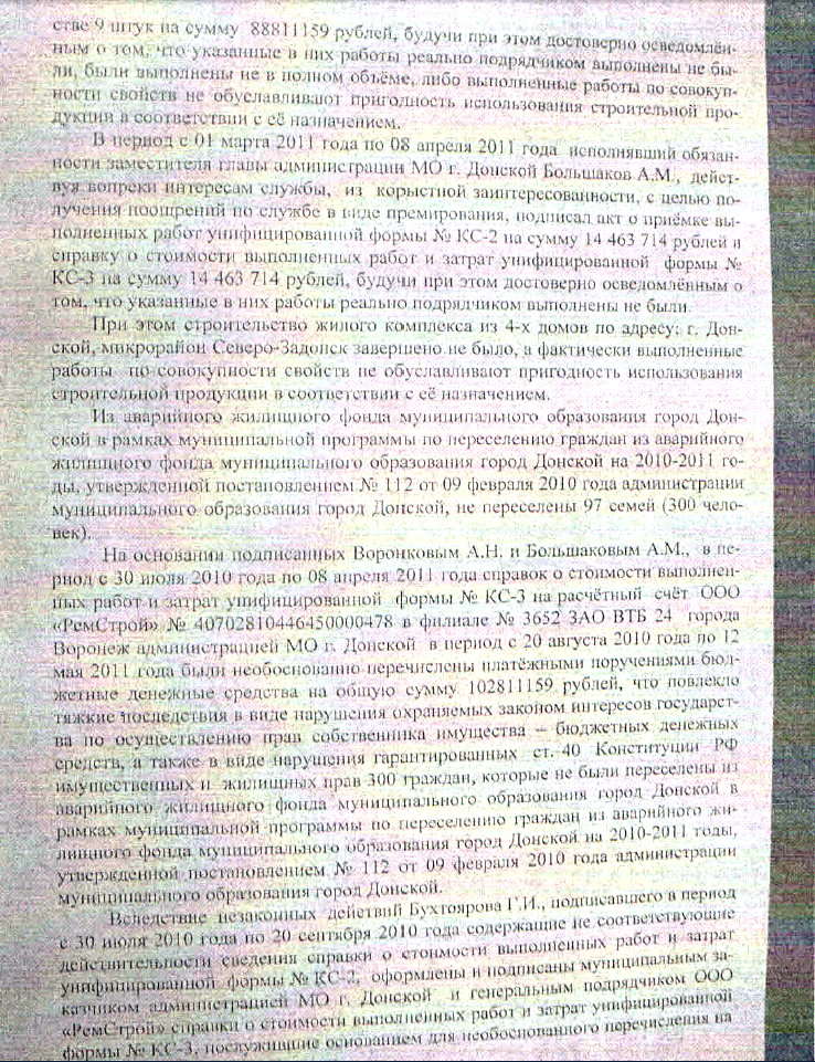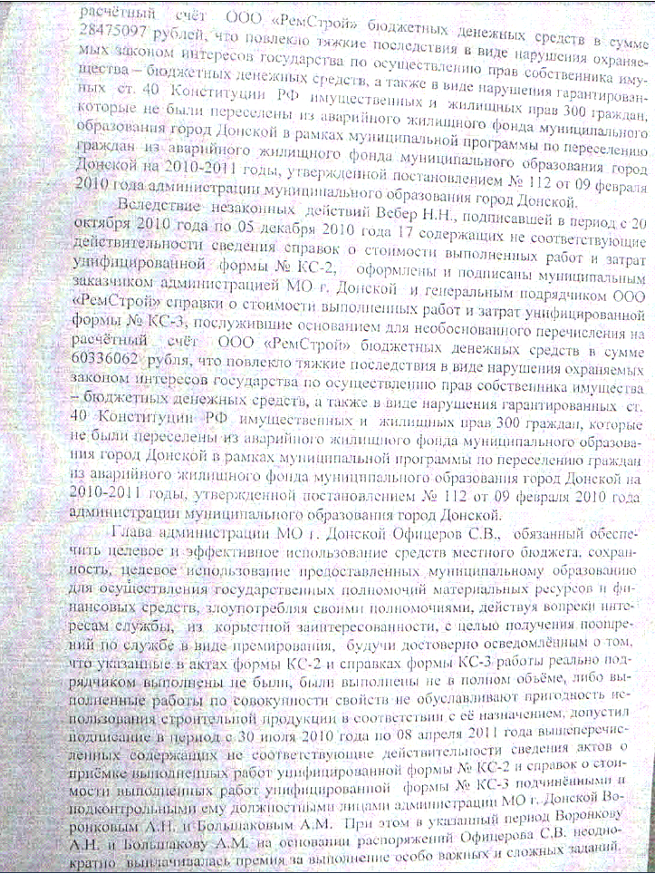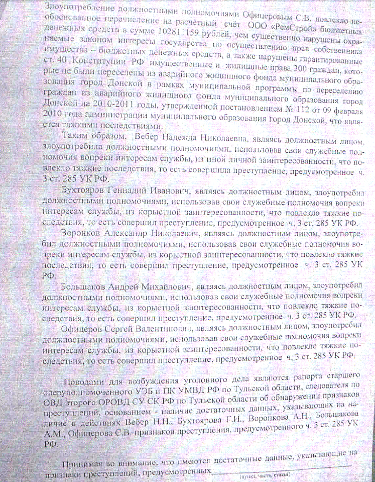«На основании подписанных должностными лицами документов администрацией МО г. Донской в период с августа 2010 по май 2011 года коммерческой организации, занимавшейся строительством жилого комплекса перечислены бюджетные денежные средства на общую сумму свыше 102 млн. рублей, что повлекло тяжкие последствия в виде нарушения охраняемых законом интересов государства, а также гарантированных ст. 40 Конституции РФ имущественных и жилищных прав 300 граждан, которые не были переселены из аварийного жилищного фонда в рамках соответствующей муниципальной программы на 2010-2011 годы»,- сообщала ранее пресс-служба СУ СКР по Тульской области.