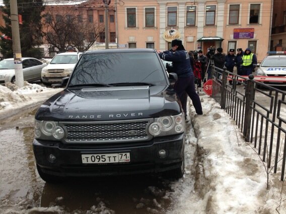 Наш коллега, тульский фотограф Андрей Варенков в твиттере выложил фото, на котором видно, что блокированный ДПС автомобиль — темный «Рейндж Ровер». Источник назвал и номер машины — Т 095 ТТ 71.