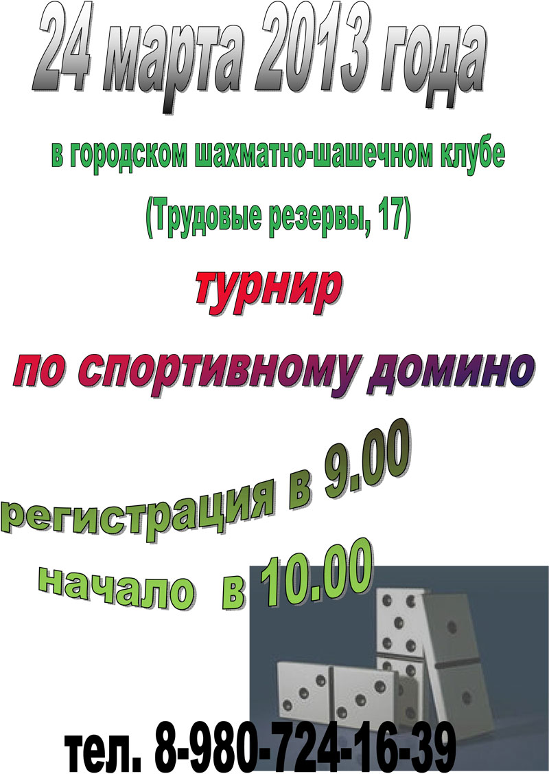 «24 мар­та в го­род­ском шах­ма­то-ша­шеч­ном клу­бе состоится тур­нир по спор­тивно­му до­мино», — сообщили в пресс-службе администрации МО г.Новомосковск Тульской области.