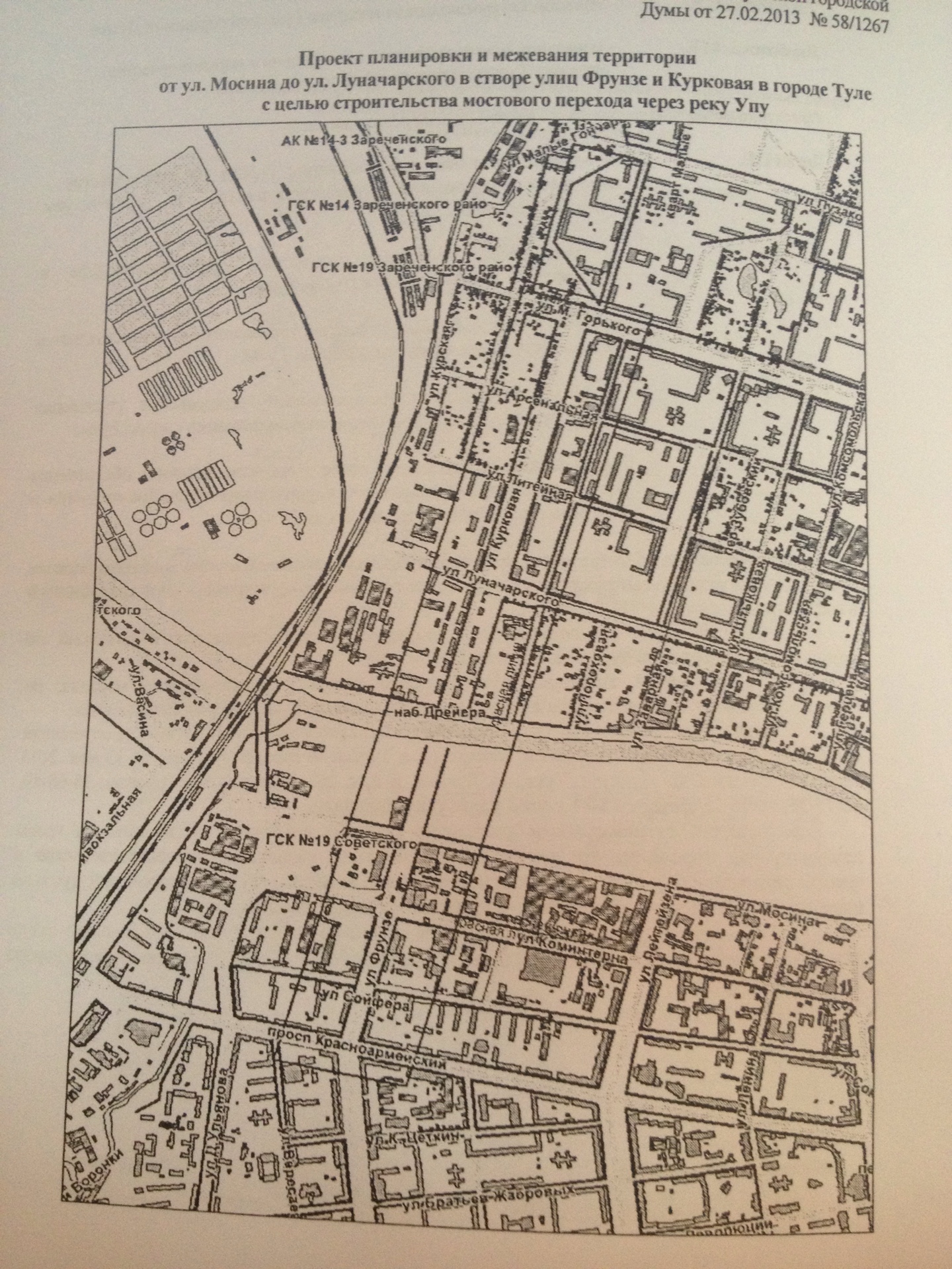 Корреспондент ИА «Тульская пресса» с проходящих в этим минуты в Тульской городской Думе публичных слушаний прислал в редакцию проект планировки и межевания территории от улицы Мосина до улицы Луначарского в створе улиц Фрунзе и Курковой для строительства нового моста через Уп.