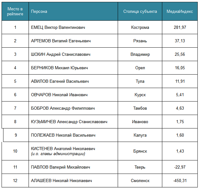 «Лидерами медиарейтинга глав администраций столиц субъектов ЦФО в мае 2013 года стали Виктор Емец (Кострома), Виталий Артемов (Рязань) и Андрей Шохин (Владимир).