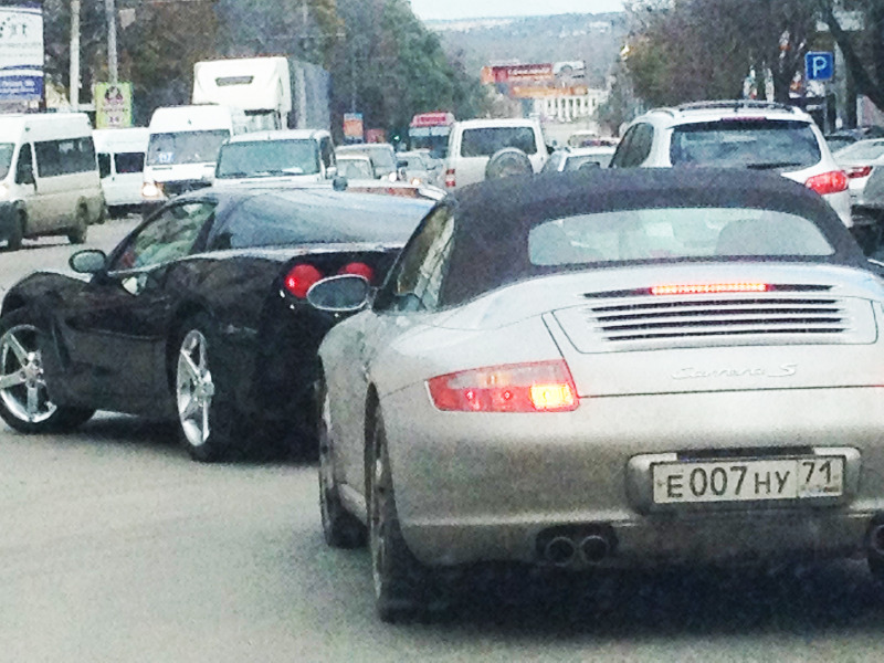 На них два, вне всякого сомнения, культовых автомобиля — Porsche 911 Carrera S и Chevrolet Corvette — схвачены объективом смартфона в момент нарушения ПДД на одном из центральных перекрестков Тулы.