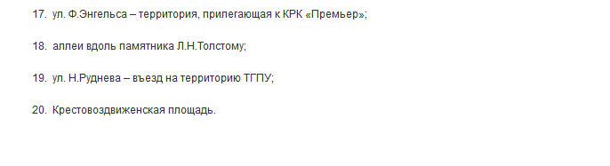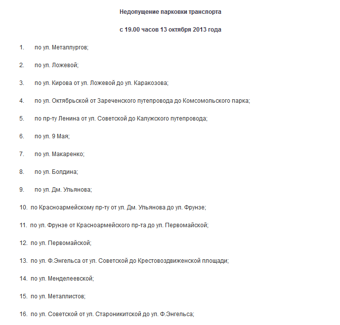 В пресс-службе правительства ИА «Тульская пресса» предоставили перечень мест, где не будет допускаться парковка транспорта с 19.00 часов 13 октября 2013 года.
