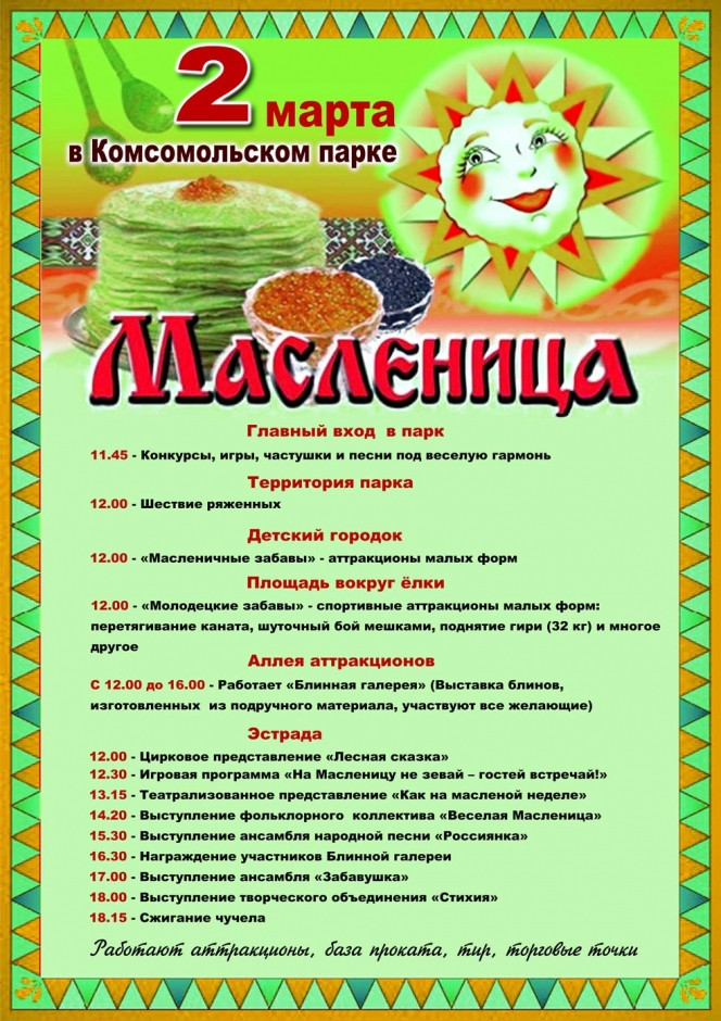 Жителей Тулы в воскресенье ждет обширная праздничная программа в Комсомольском парке. Как уже писало ИА «Тульская пресса», 2 марта парки города приглашают отпраздновать Широкую масленицу.