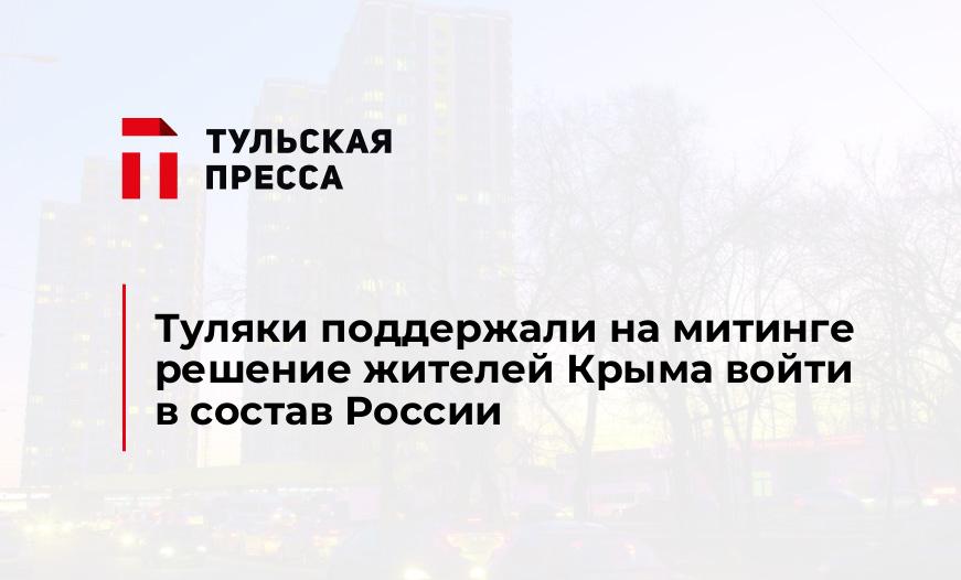 Со словами поддержки братского народа Крыма выступили председатель Тульского отделения Общероссийского народного фронта Евгений Дронов, руководитель исполкома ТРО ВПП «Единая Россия» Юлия Вепринцева, олимпийская чемпионка Ольга Слюсарева, председатель Тульской областной организации Российского Союза ветеранов Афганистана Алексей Альховик и другие общественные деятели и политики.