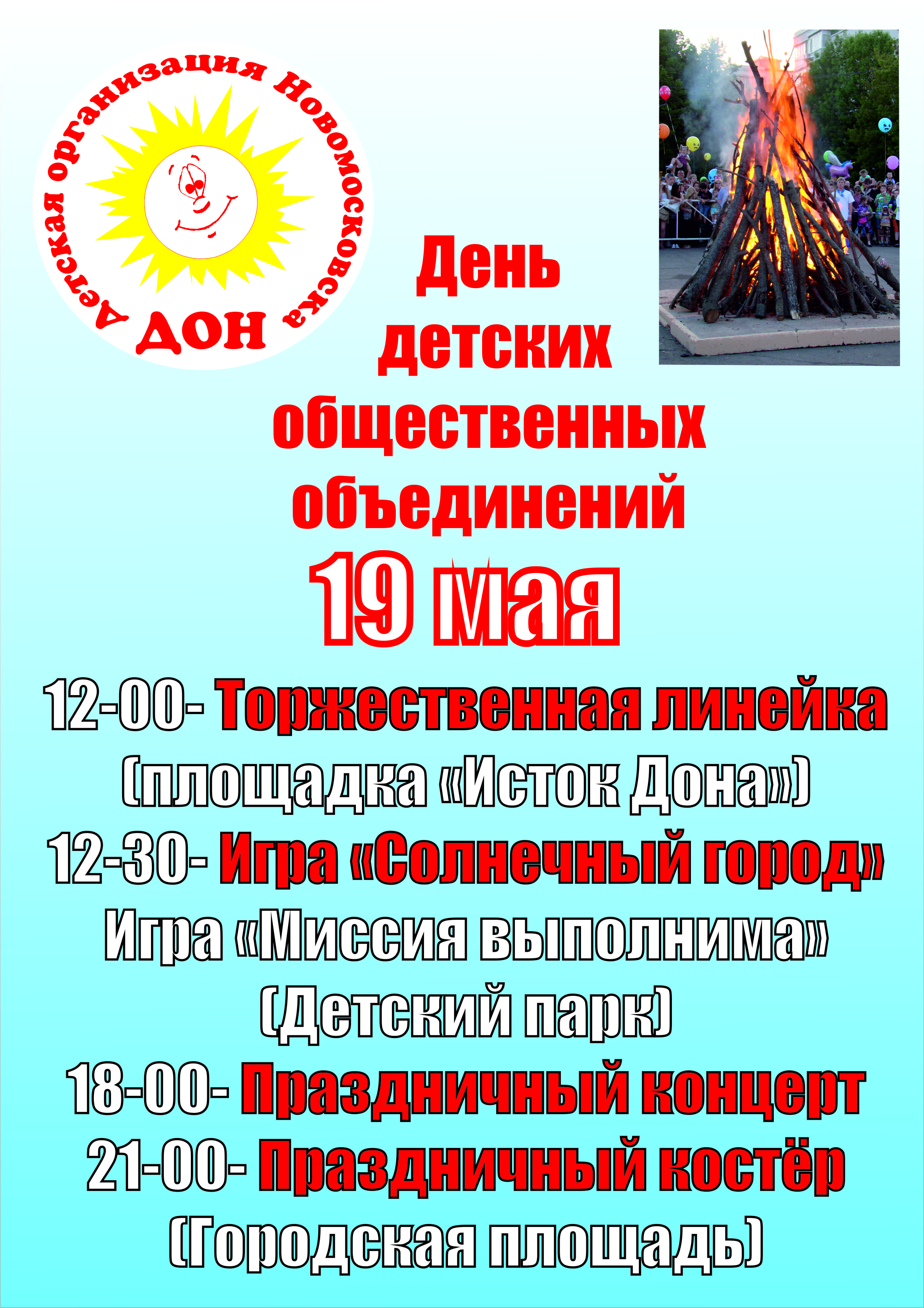 «В 12 часов у скульптурной композиции «Исток Дона» пройдёт торжественная линейка, посвящённая празднику, во время которой пройдёт торжественный приём в ряды ДОО «ДОН» новых членов, затем в Детском парке пройдут игры на местности «Солнечный город» и «Миссия выполнима», — сообщили в пресс-службе администрации МО г.Новомосковск Тульской области.