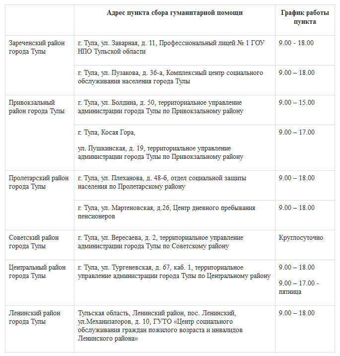 Пресс-служба администрации Тулы предоставила ИА «Тульская пресса», адреса 10 пунктов сбора гуманитарной помощи для граждан, прибывших с территории Украины. Они работают в каждом районе города.