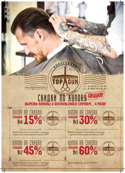 Желающим получить скидку необходимо будет или распечатать купон и прийти с ним в Барбершоп «TOPGUN» или прийти и сказать пароль: «Тульская пресса».