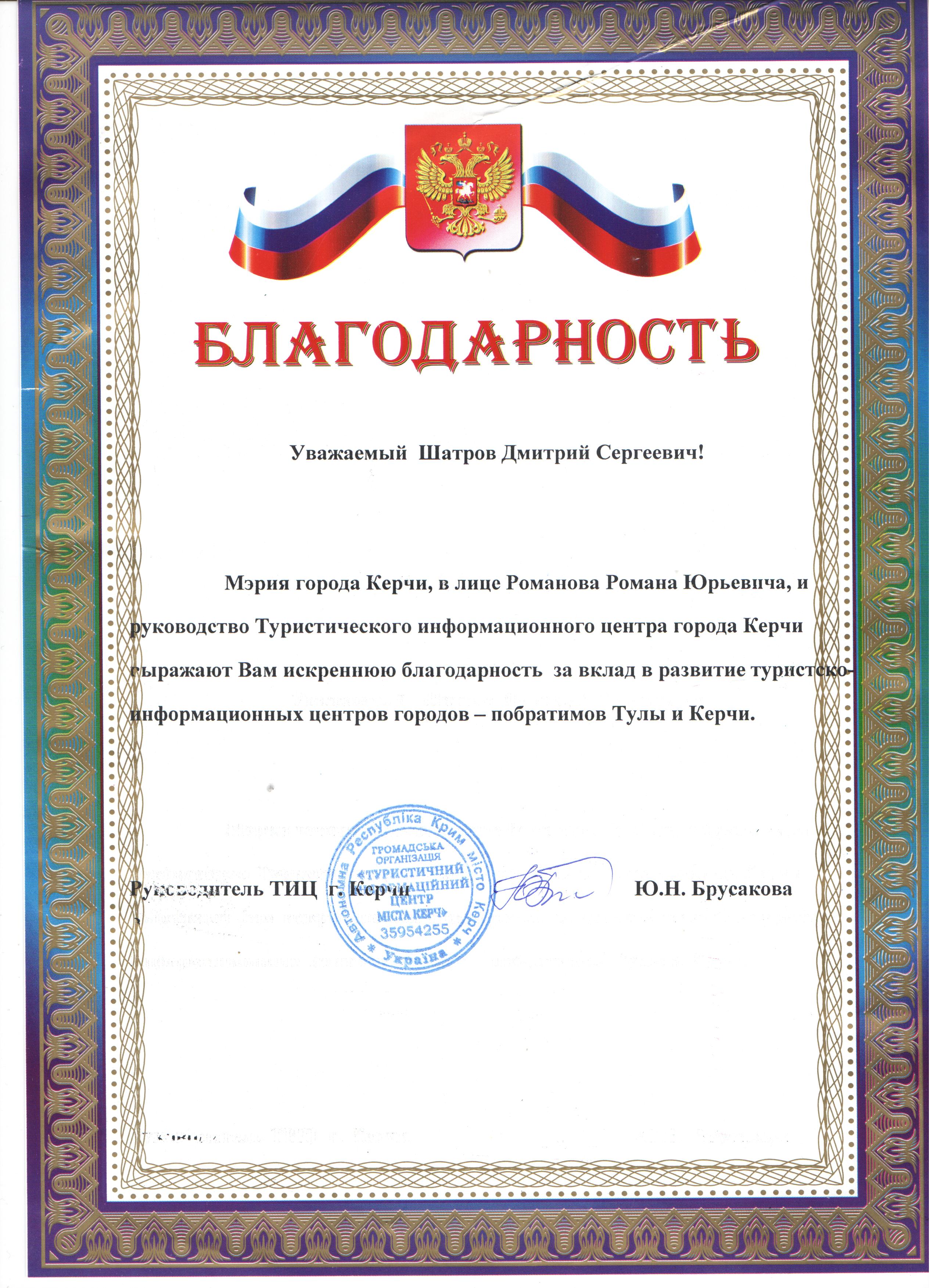 Мэр г. Керчь Романов Роман Юрьевич выразил личную благодарность Генеральному директору Тульского областного туристско – информационного центра Дмитрию Сергеевичу ШАТРОВУ за личный вклад в развитие внутреннего туризма, а так же за помощь, оказанную г. Керчь.