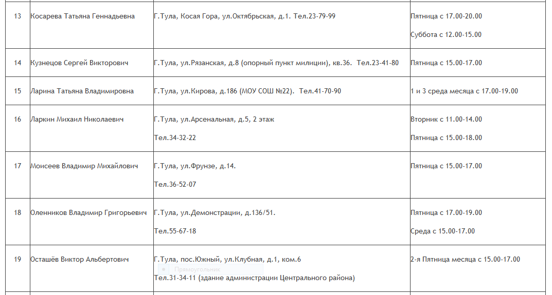 ГРАФИК ПРИЕМА ГРАЖДАН депутатами Тульской городской Думы 5-го созыва в избирательных округах