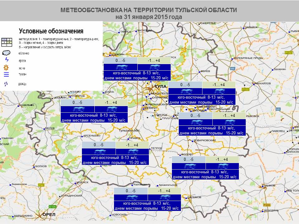Температура воздуха ночью 0…-5°С, днем -1…+4°С. Атмосферное давление 730-735 мм рт. ст. Метеорологическая дальность видимости хорошая — 7000 м, во время осадков – 5000 м», — сообщили в пресс-службе ГУ МЧС России по Тульской области.