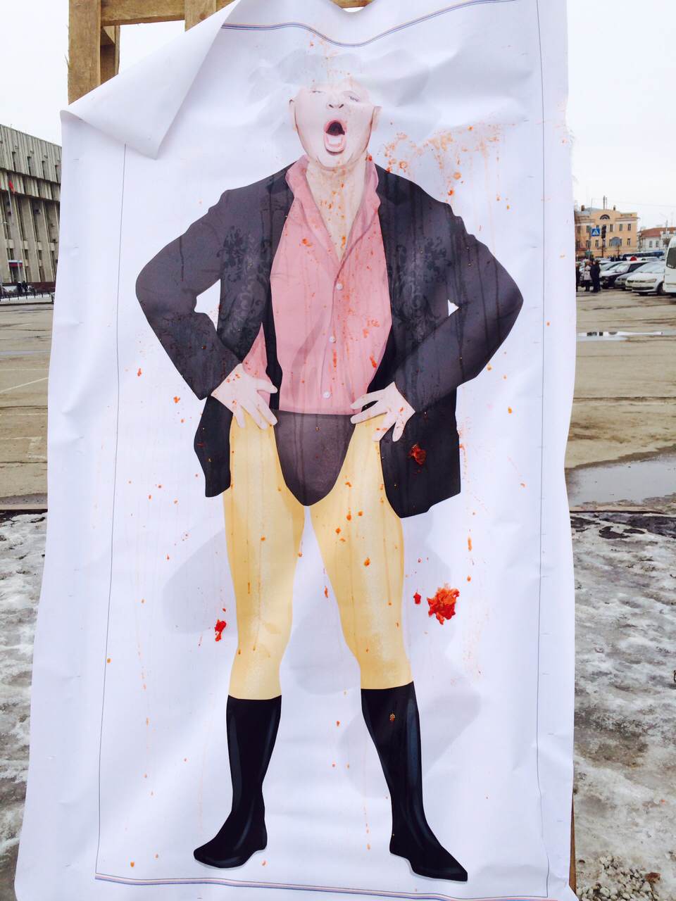 Собравшиеся решили развлечься необычно. С расстояния 5 метров они по очереди бросали в плакат помидоры. Зачем это делалось нам объяснил один из организаторов перфоманса.