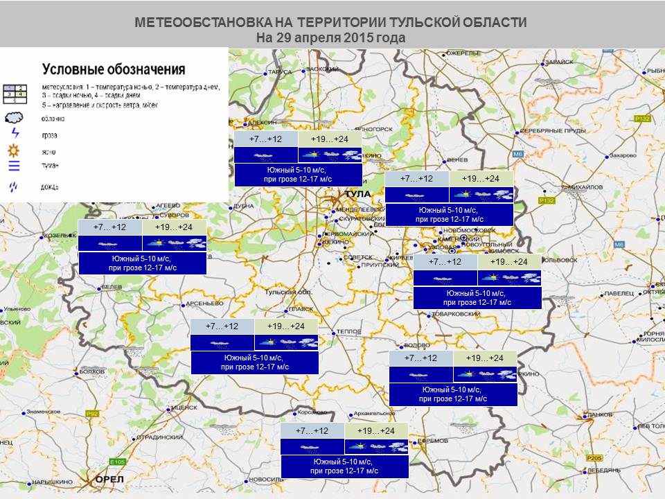 Ветер южный ночью 5-10 м/с, при грозе порывы 12-17 м/с. Температура воздуха ночью +7…+12ºС, днем +19…+24ºС. Атмосферное давление 740-745 мм рт. ст. Метеорологическая дальность видимости – 7000 м, во время осадков 5000 м», — сообщили в пресс-службе ГУ МЧС России по Тульской области.