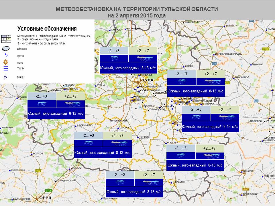 Температура воздуха ночью -2…+3 оС, днем +2…+7оС. Атмосферное давление 730-735 мм рт. ст. Метеорологическая дальность видимости хорошая – 7000 м, во время осадков – 5000 м», — сообщили в пресс-службе ГУ МЧС России по Тульской области.