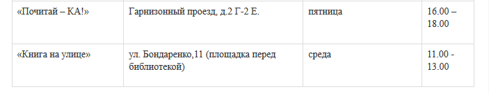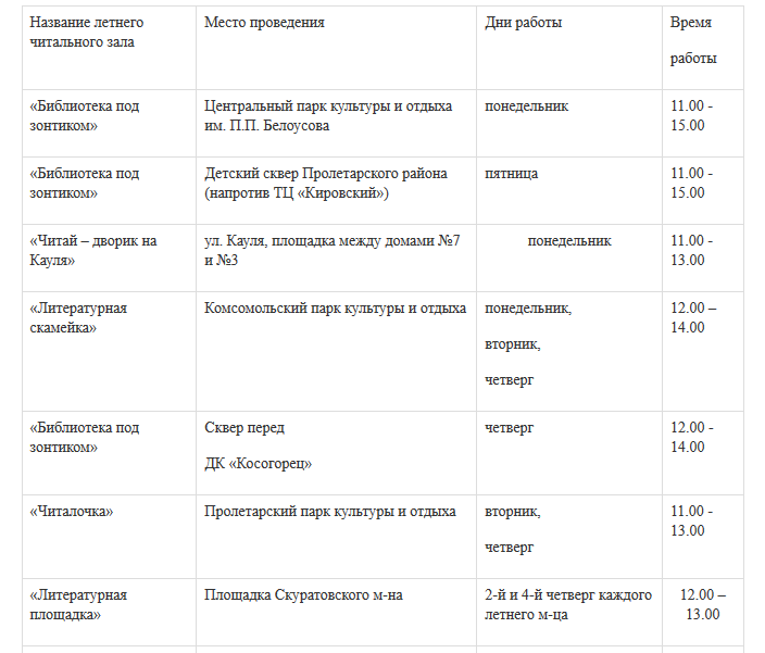 Как отметили в пресс-службе администрации Тулы, работать летние читальни будут до 31 августа по следующему графику: