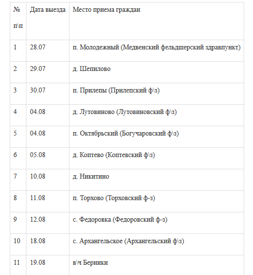В рамках приема можно получить консультацию терапевта и направление к врачу-специалисту, сделать ЭКГ, измерить давление, сдать необходимые анализы (выездные бригады оснащены лабораторией). В ближайшем будущем лаборатории будут оснащены оборудованием для проведения флюорографического исследования.