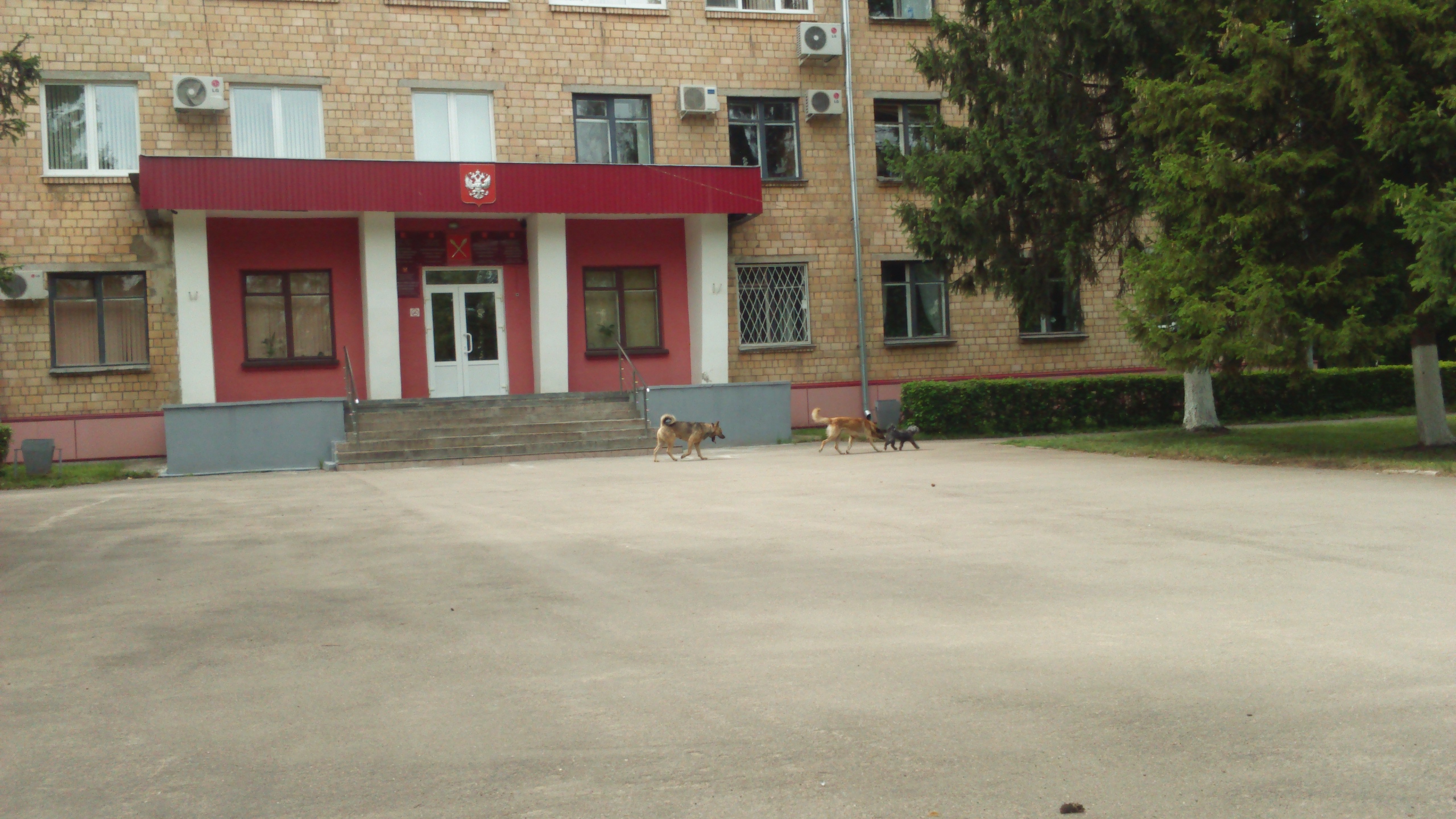 Так, вот. Это было в июне, а в июле — мы совершенно спокойно увидели стайку бездомных собак, неспешно резвящихся не где-нибудь, а, прямо, у ступеней здания администрации МО г.Алексин.