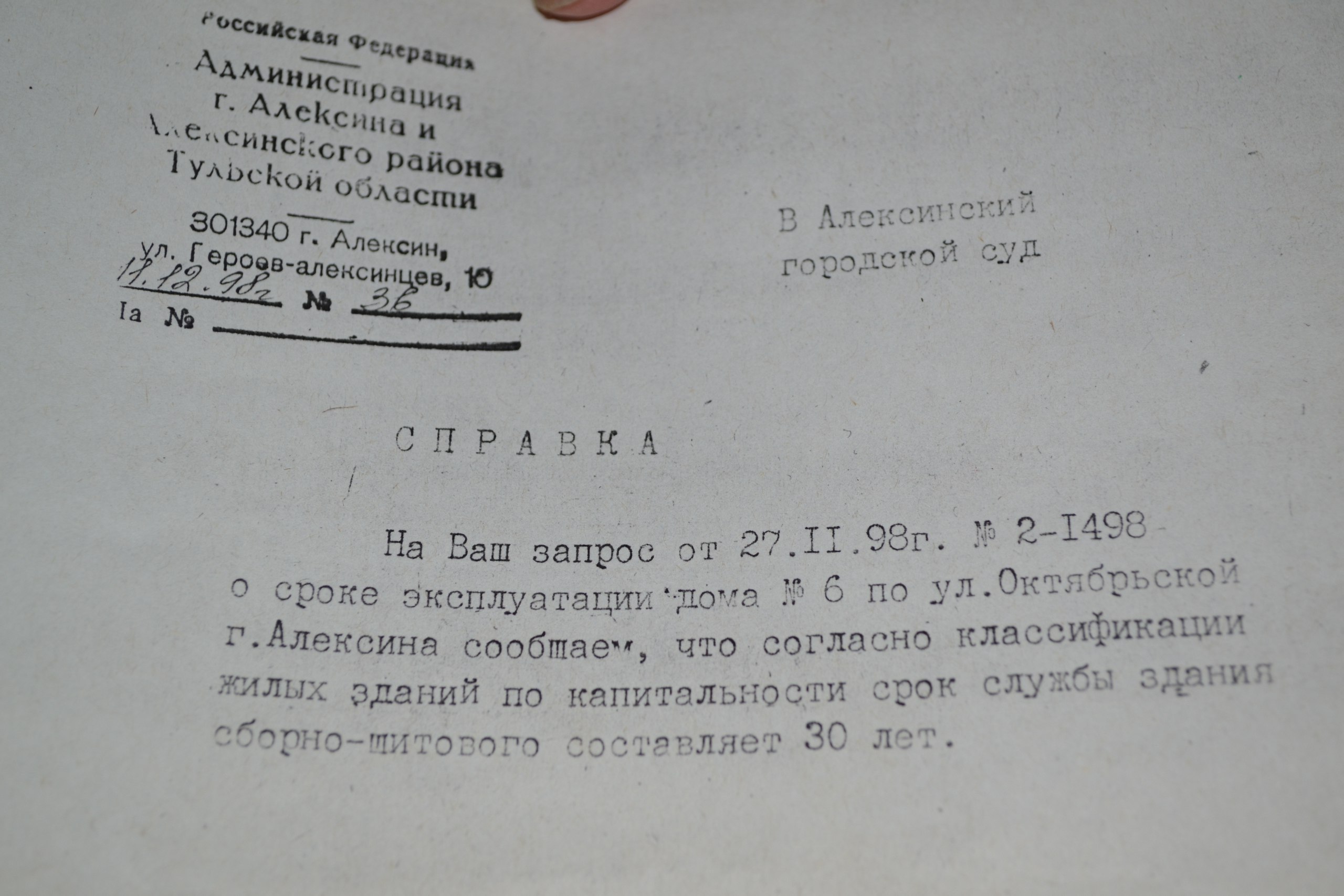 «Запросили справку в архитектурном отделе. Там сказали, что дом должен стоять 30 лет», — сообщает пенсионерка Раиса Дмитриевна и показывает соответствующий документ. Тем не менее, ситуация такова, что и спустя столько времени люди вынуждены оставаться в непригодных для проживания условиях.