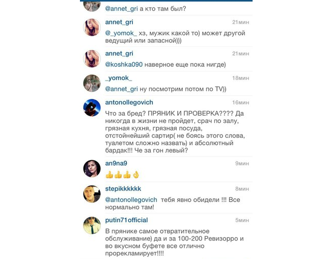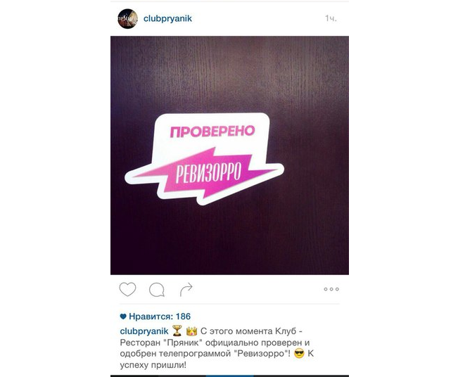 Инстаграм заведения сообщил: «С этого момента Клуб-Ресторан «Пряник» официально проверен и одобрен телепрограммой «Ревизирро»! К успеху пришли!»