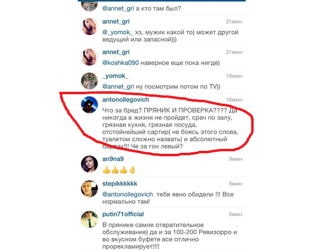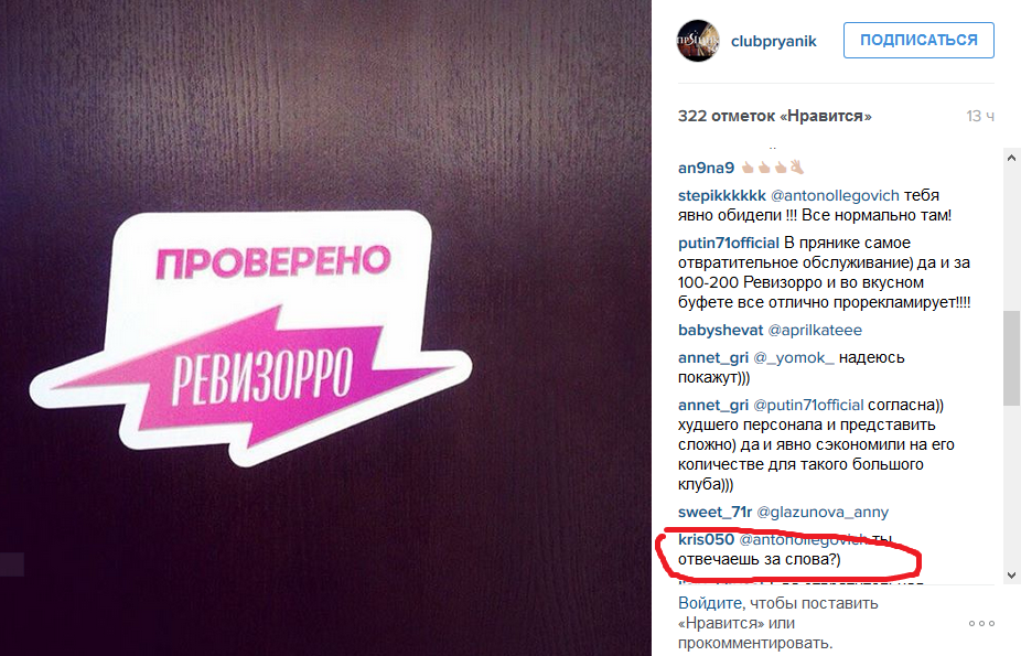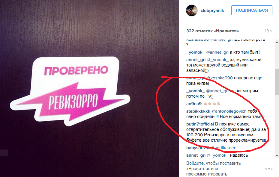 Инстаграм заведения сообщил: «С этого момента Клуб-Ресторан «Пряник» официально проверен и одобрен телепрограммой «Ревизирро»! К успеху пришли!»