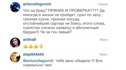 Интересный момент, на достаточно жесткое критическое замечание по поводу кухни и сервиса пользователя @antonollegovich ответил обладатель ника kris050 репликой: «@antonollegovich ты отвечаешь за слова?)».