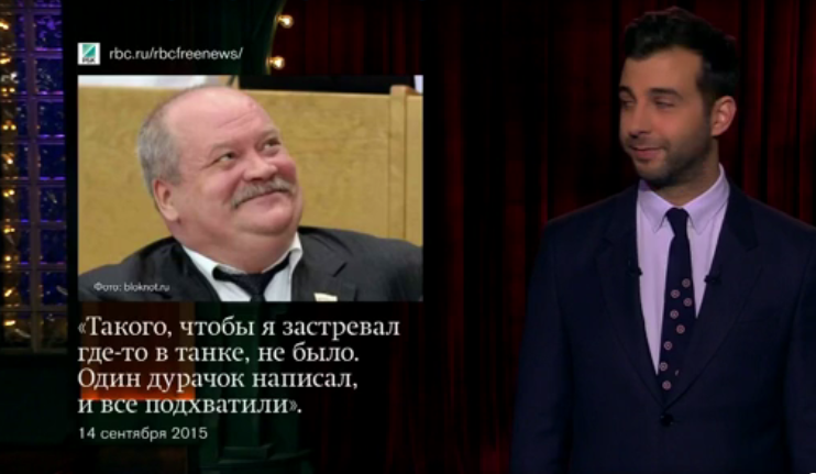 Иван Ургант, в частности, сообщил, буквально, следующее: «Депутат Госдумы Игорь Зотов на пять часов застрял в танке на выставке в Нижнем Тагиле. По данным издания, спустя некоторое время после того как Зотов спустился в кабину, посетители выставки обратили внимание, что политик не может вылезти обратно.