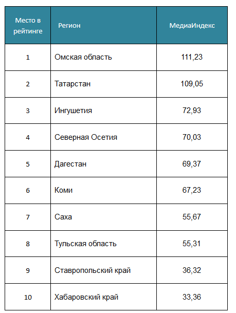 Тульский регион вошел в первую десятку медийного рейтинга. Как стало известно ИА «Тульская пресса», компания «Медиалогия» подготовила медиарейтинг регионов РФ по выполнению и реализации пакета указов, подписанных президентом Владимиром Путиным в мае 2012 года.