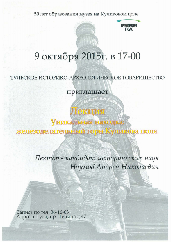 Как стало известно ИА «Тульская пресса», лекция под названием «Уникальная находка: железоделательный горн Куликова поля» состоится 9 октября.
