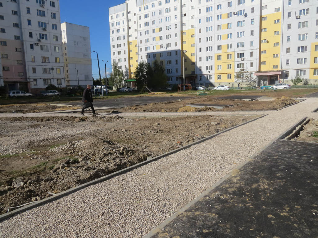 Как отмечается, на пешеходных дорожках уже уложен щебень и частично произведено их асфальтирование. Также заасфальтированы площадки под спортивное и игровое оборудование. Проводятся подготовительные работы перед установкой бортового камня.