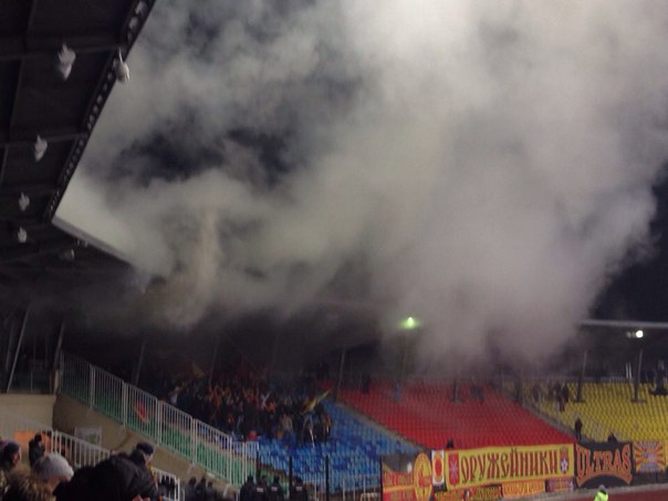 Фанаты оружейников на северной трибуне активно жгут пиротехнику. Пока счет 0:2.