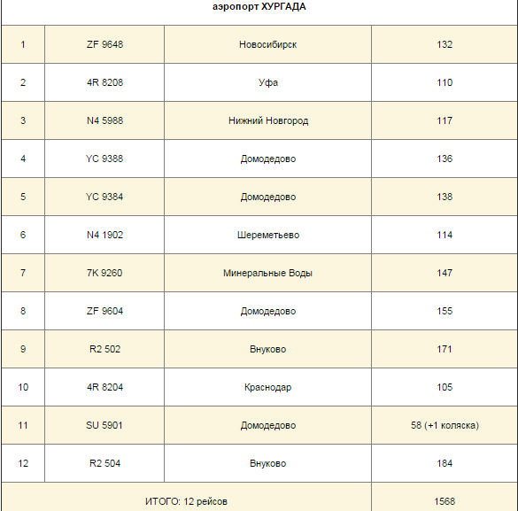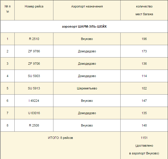 ИА «Тульская пресса» публикует информацию о номерах рейсов и доставляемом багаже российских туристов, прибывающих из Египта в столичные аэропорты.