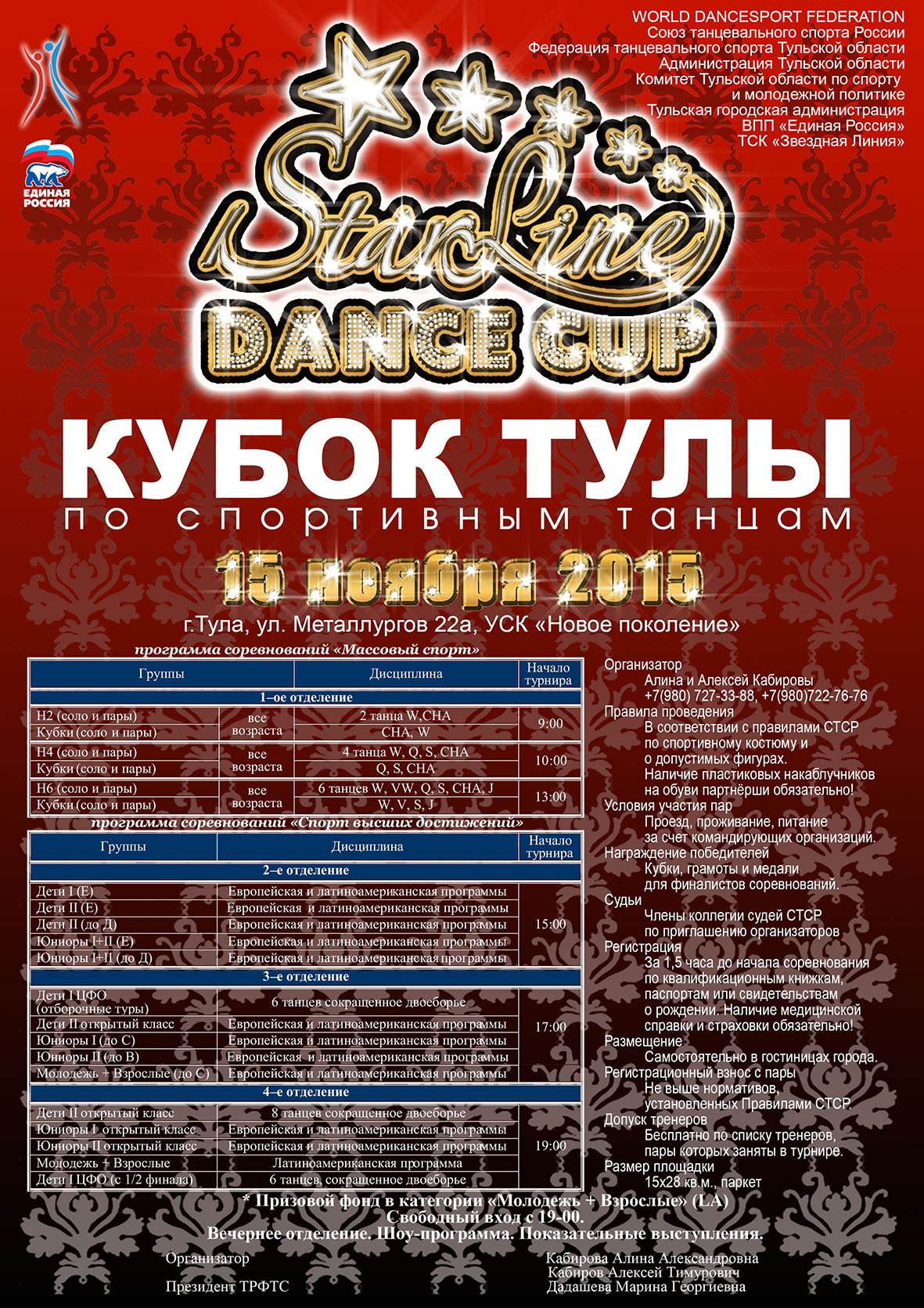 На него соберутся лучшие танцевальные пары со всей России. Соревнования проводятся при поддержке Союза танцевального спорта России, Федерации танцевального спорта Тульской области, правительства Тульской области, администрации города Тулы, ВПП «Единая Россия».