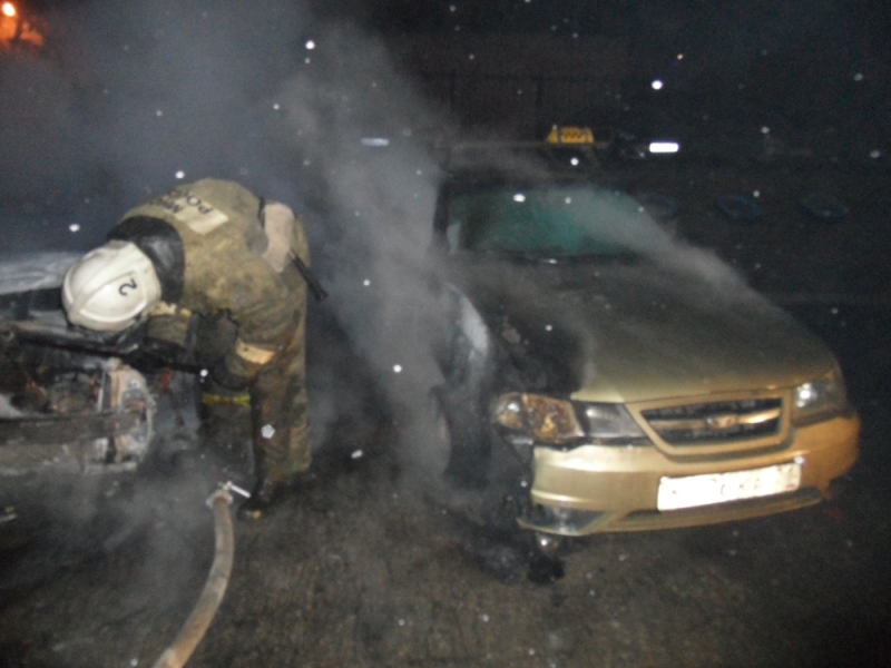 В 01.12 на пульт диспетчера Единой службы спасения-112 поступило сообщение о возгорании автомобилей «Хендай Солярис» и «Дэу Нексия» на улице М.Горького. На место происшествия выехали два пожарных расчета ПСЧ-2.