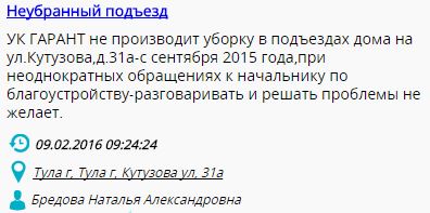 А, вот, в общем помещении дома 31а по улице Кутузова управляющая компания «Гарант» не производила уборку с сентября 2015 года. «При неоднократных обращениях к начальнику по благоустройству — разговаривать и решать проблемы не желает», — заявляет жительница Наталья Бредова.