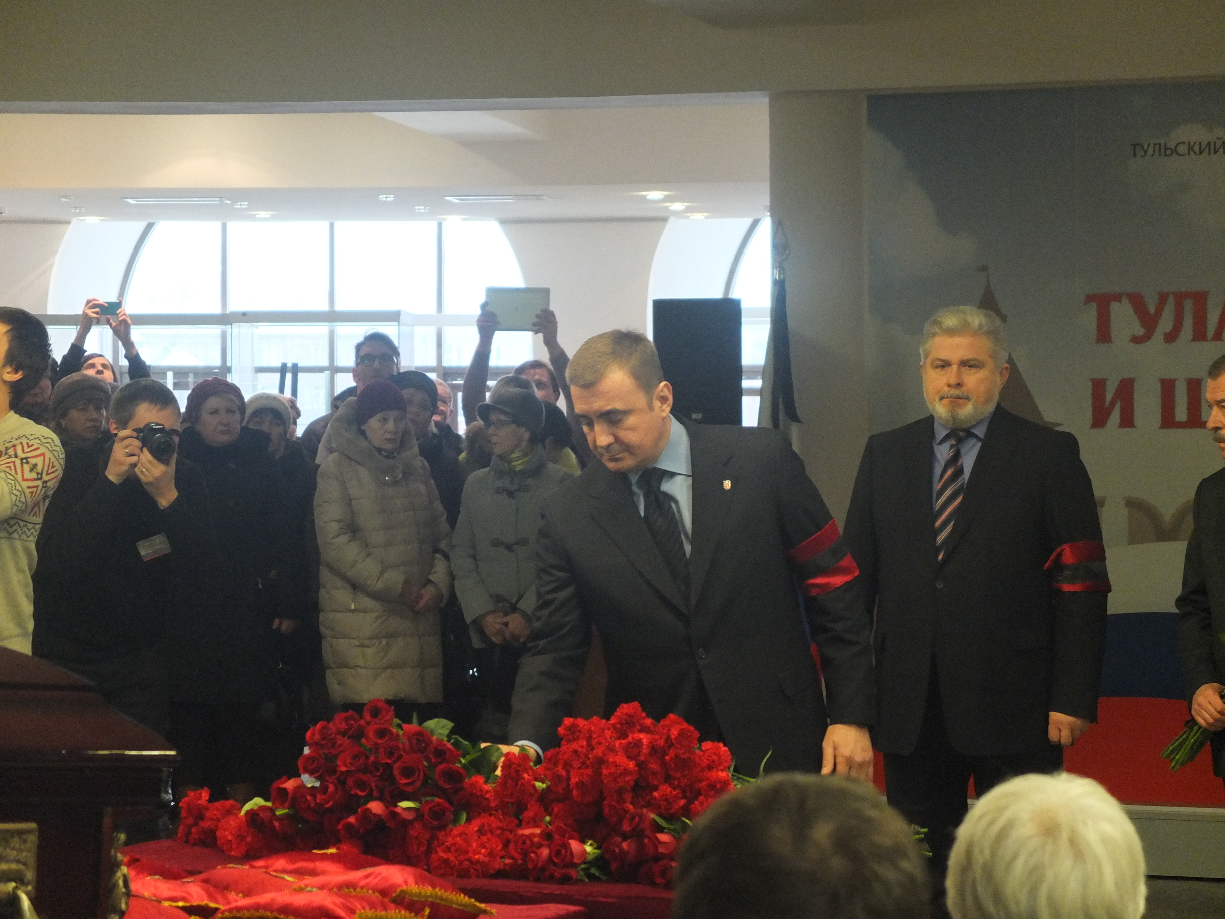 Как сообщает с места событий наш корреспондент, врио губернатора Алексей Дюмин отдал дань уважения памяти легендарного конструктора-оружейника, после чего выразил соболезнования близким покойного.