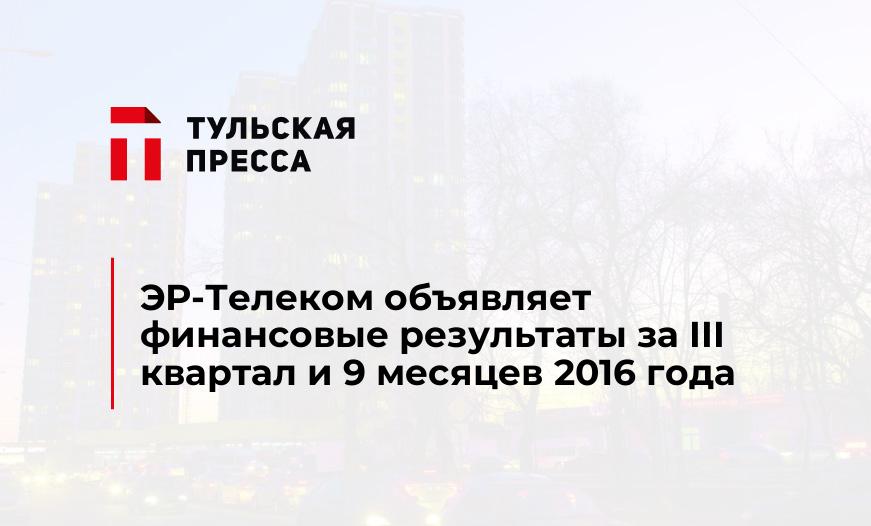 АО «ЭР-Телеком Холдинг», национальный оператор фиксированной связи, объявляет консолидированные финансовые результаты (неаудированные) по МСФО[1] за III квартал и 9 месяцев 2016 года.