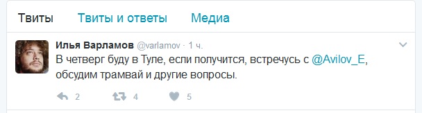 Как ранее сообщало ИА «Тульская пресса», Авилов пригласил в твиттере Варламова в Тулу, чтобы обсудить развитие города и судьбу тульских трамваев, которым в свете последних событий блогер посвятил несколько постов в ЖЖ.