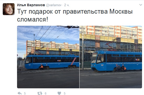 Блогер Илья Варламов, приехавший в Тулу сегодня, сфотографировал стоящий трамвай на улице Советской, сообщив, что он «сломался».