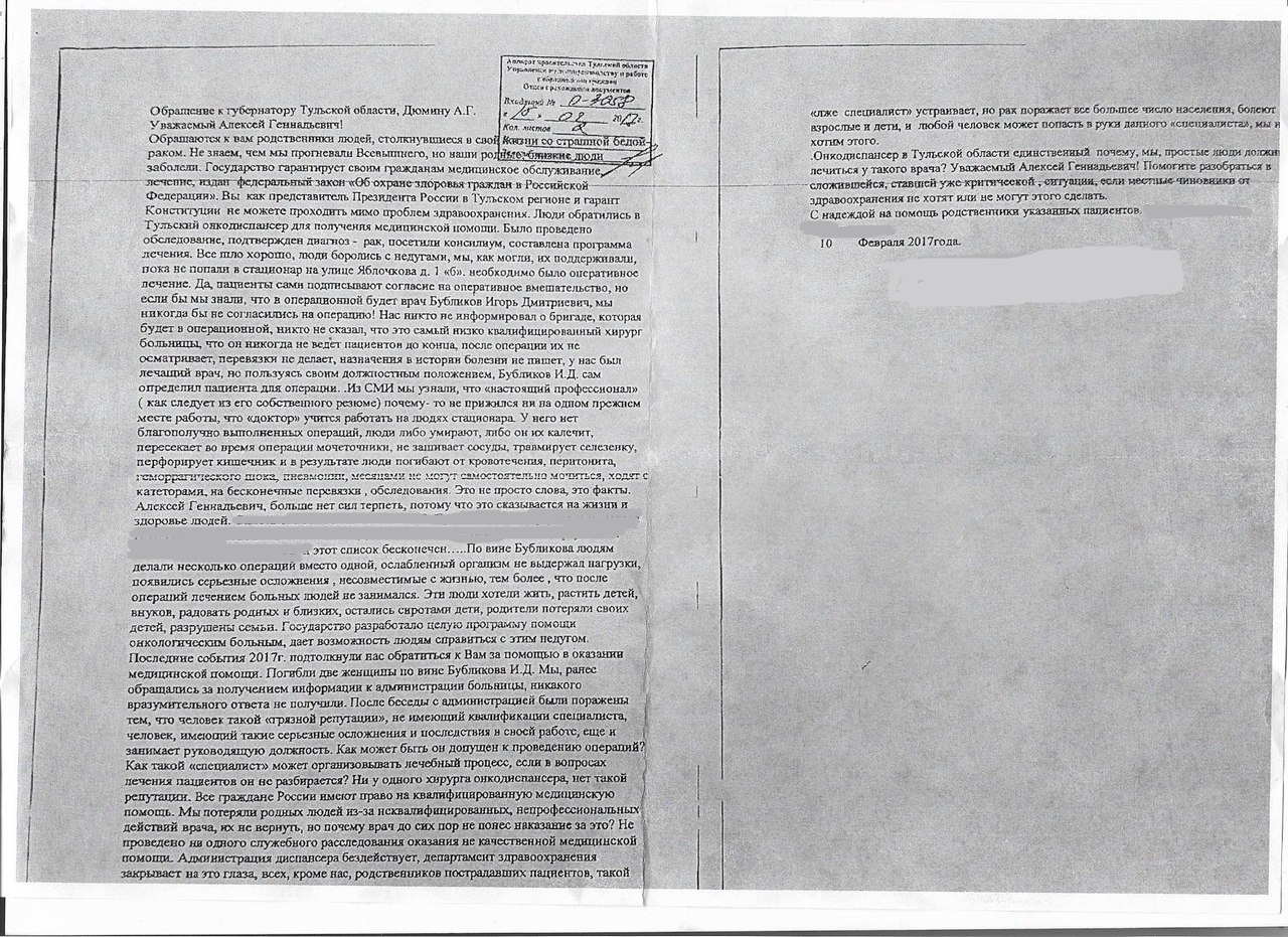 Авторы обращения рассказали, что обратиться к главе региона их подтолкнули последние события этого года, когда погибли две женщины, прооперированные Бубликовым.
