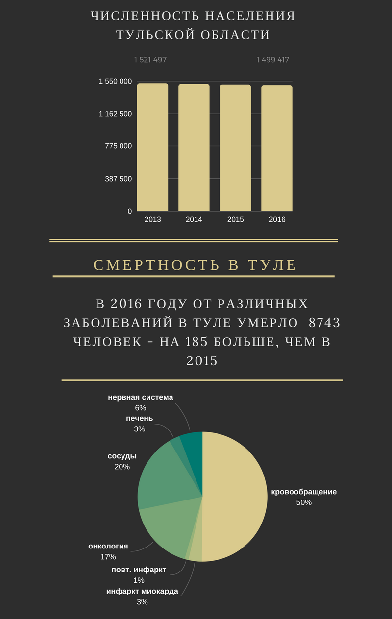 Действительно, если судить по отчетам тульского министра, здравоохранение в области процветает, цифры по качеству предоставляемых услуг ползут вверх, а смертность вниз. Однако, согласно данным Ростата, смертность в регионе не только остается стабильно высокой, но и немного увеличивается, и это даже несмотря на снижение уровня смертности среди младенцев.