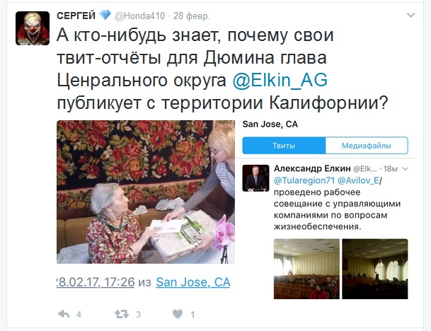 Как заметили некоторые пользователи, свои сообщения о выполненных задачах и проведенных совещания Александр Елкин публикует с геопривязкой в американском Сан-Хосе — крупном калифорнийском городе.