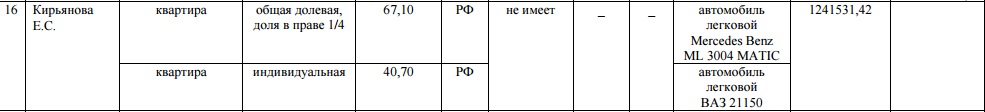Также она указала в собственности квартиру и два автомобиля: Mercedes Benz и ВАЗ-21150.