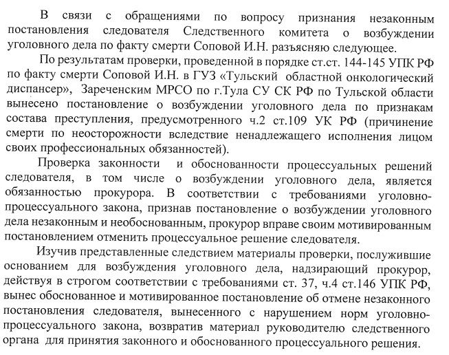 ИА «Тульская пресса» обратилась в прокуратуру региона с просьбой разъяснить вынесное Постановление о прекращении уголовного дела по факту смерти пациентки онкодиспансера Ирины Соповой.