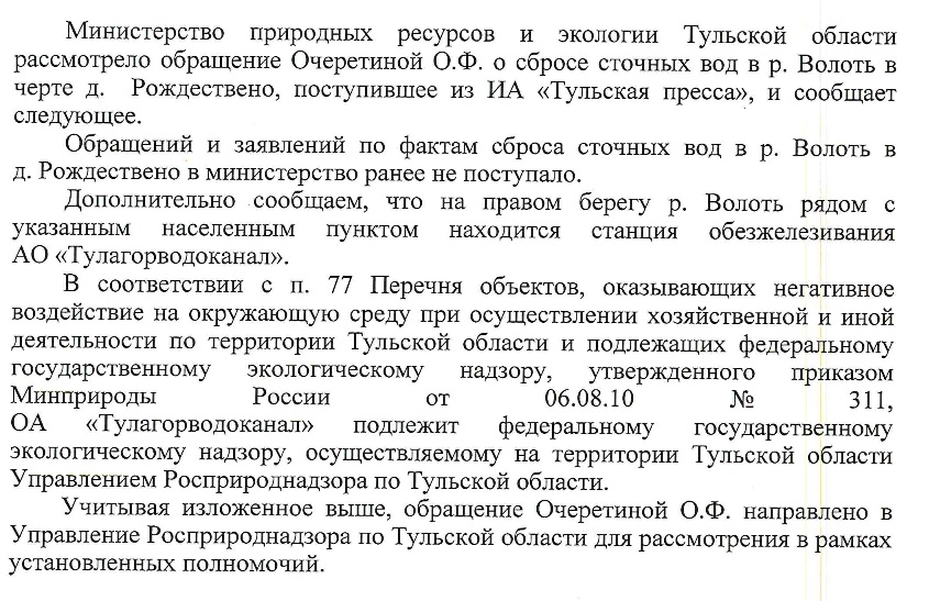 Как сообщил ИА «Тульская пресса» министр природных ресурсов и экологии Юрий Панфилов, заявлений от жительницы по поводу речки Волоть, недалеко от деревни Рождественка, не поступало.
