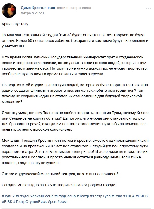 Племянник руководителя театра-студии РИСК Геннадия Крестьянкина Дмитрий опубликовал на своей странице в «ВКонтакте» пост о закрытии театра.