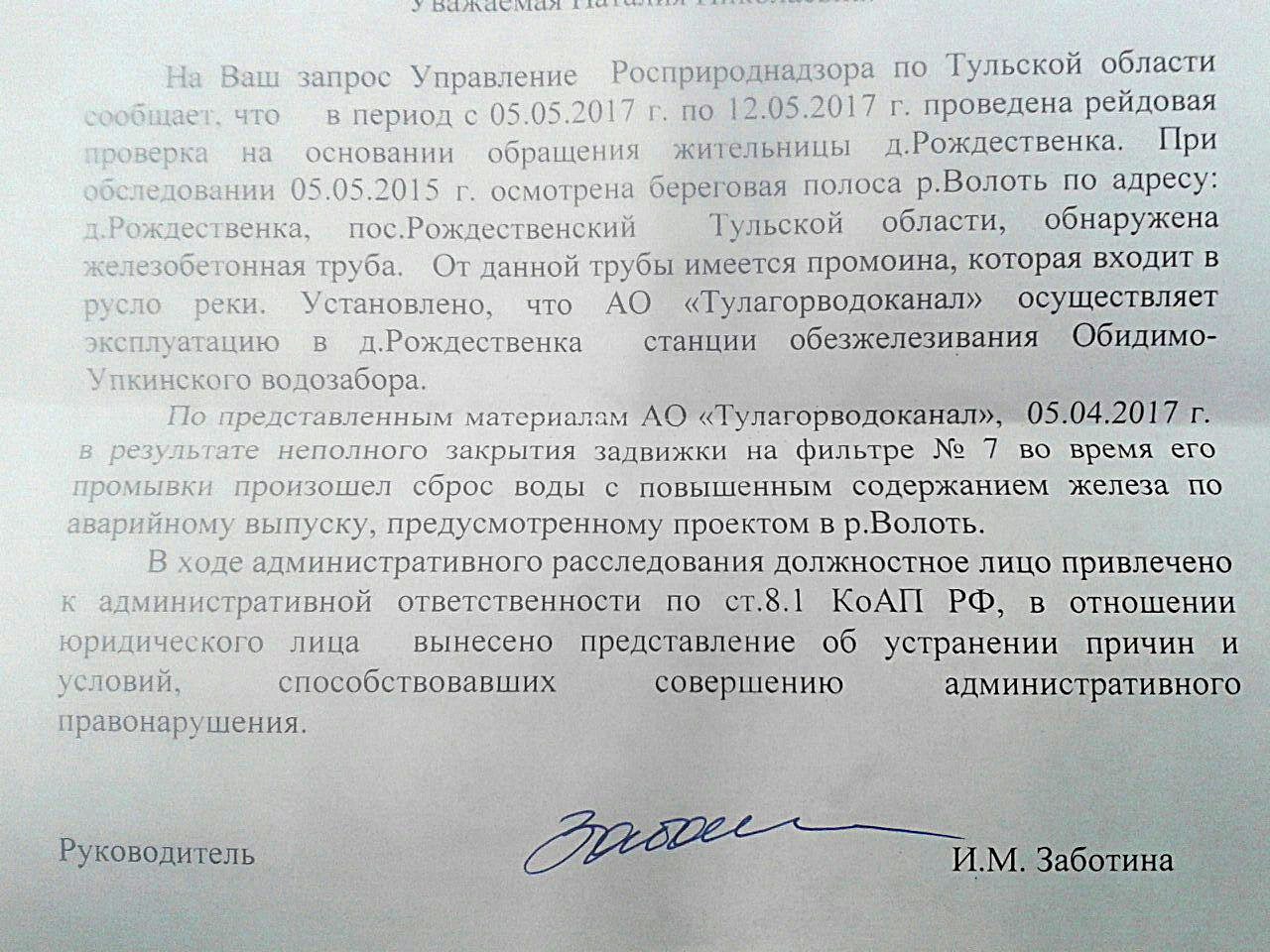 По обращению «Тульской прессы» в Министерство природных ресурсов и экологии Росприроднадзор провел проверку и установил, что «Тулагорводоканал» произвел в речку сброс воды с повышенным содержанием железа из-за неполного закрытия задвижки фильтра.